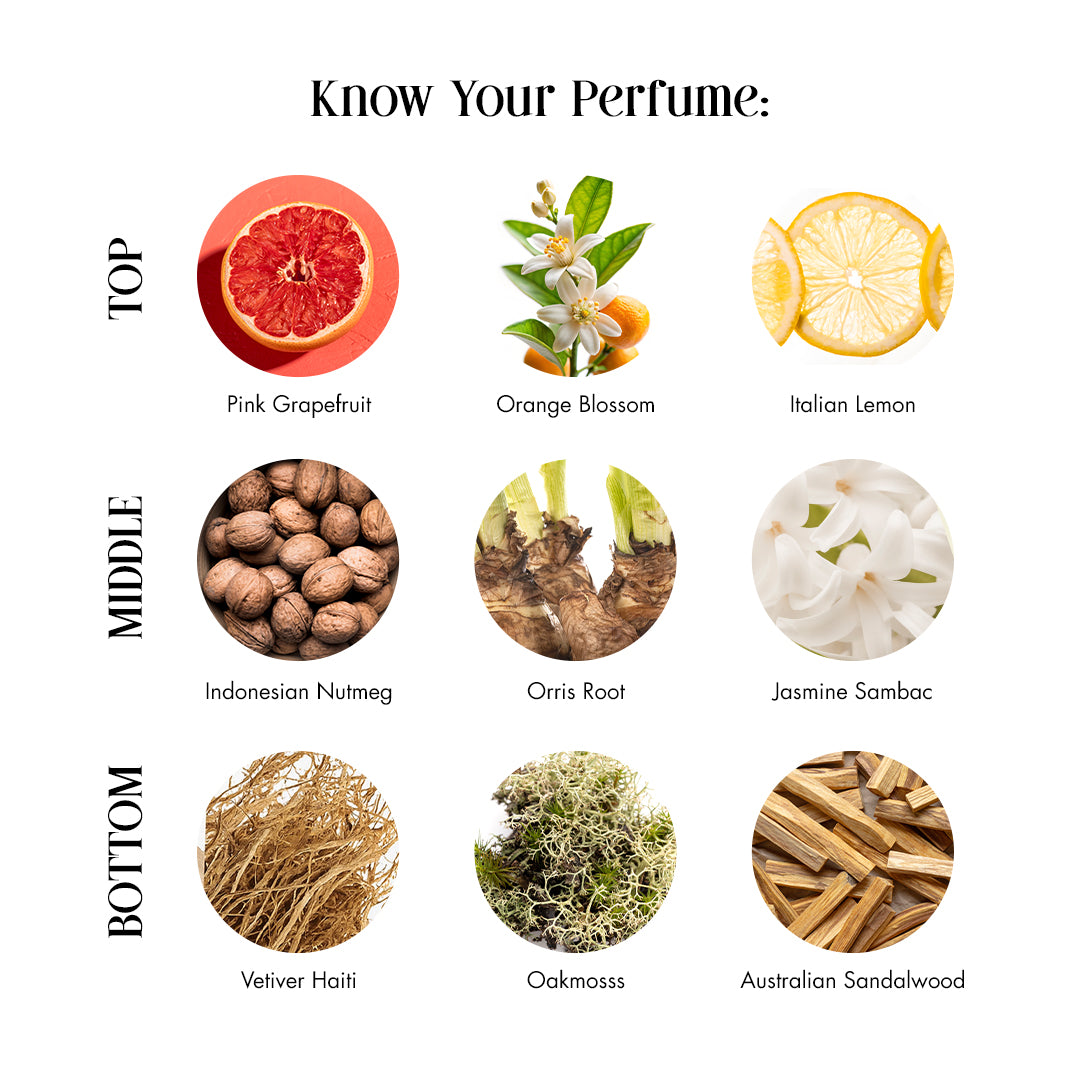 Citrus florals with a woody-spicy edge – crisp for the day, grounding for the soul. A refreshing perfume for mornings that inspire and moments that revive.