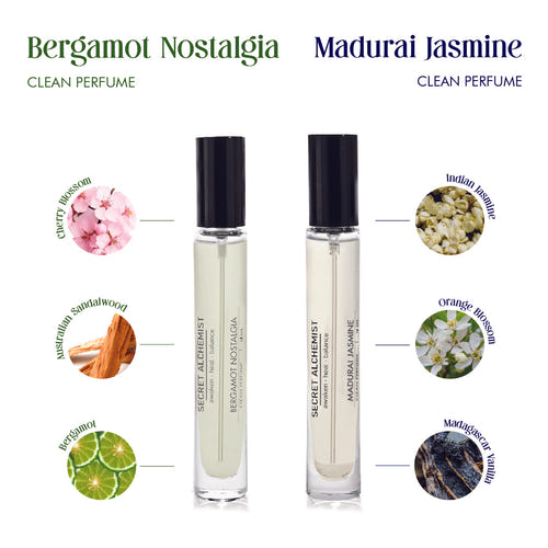 Clean perfumes are made with essential oils and grain-derived alcohol (ours is from wheat), and are free from phthalates, parabens, and synthetic dyes—ingredients linked to hormone disruption. Traditional perfumes often use synthetic fragrances and petroleum-based alcohol, which may contain undisclosed irritants.